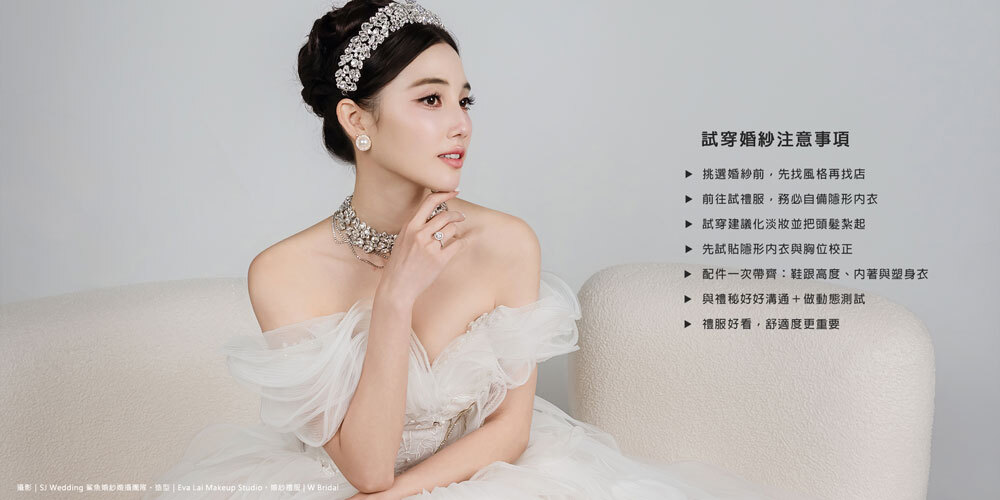 試穿不同款式婚紗時,建議帶「兩副不同類型的隱形內衣」,因為每種領口與版型的需求不同,需要彈性調整: