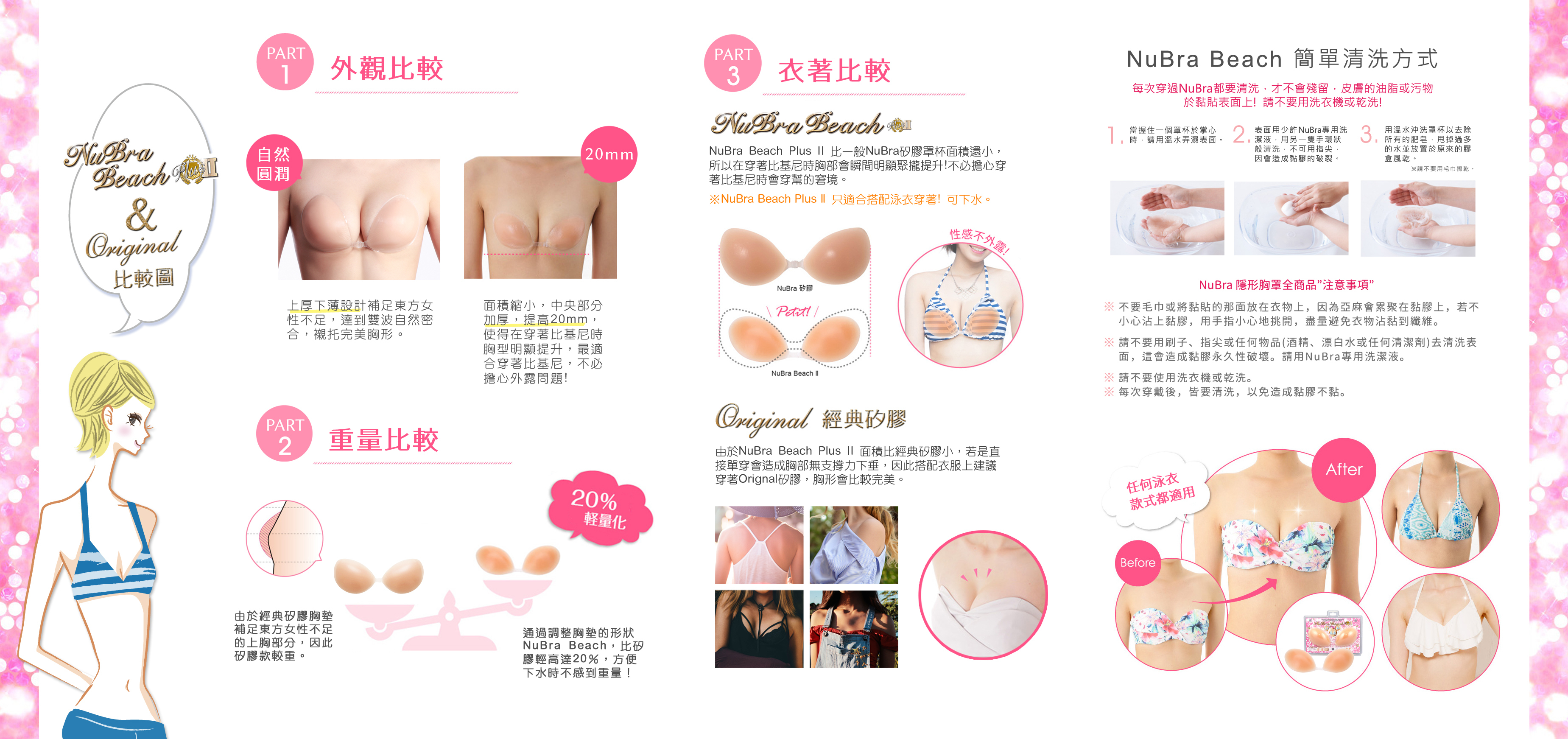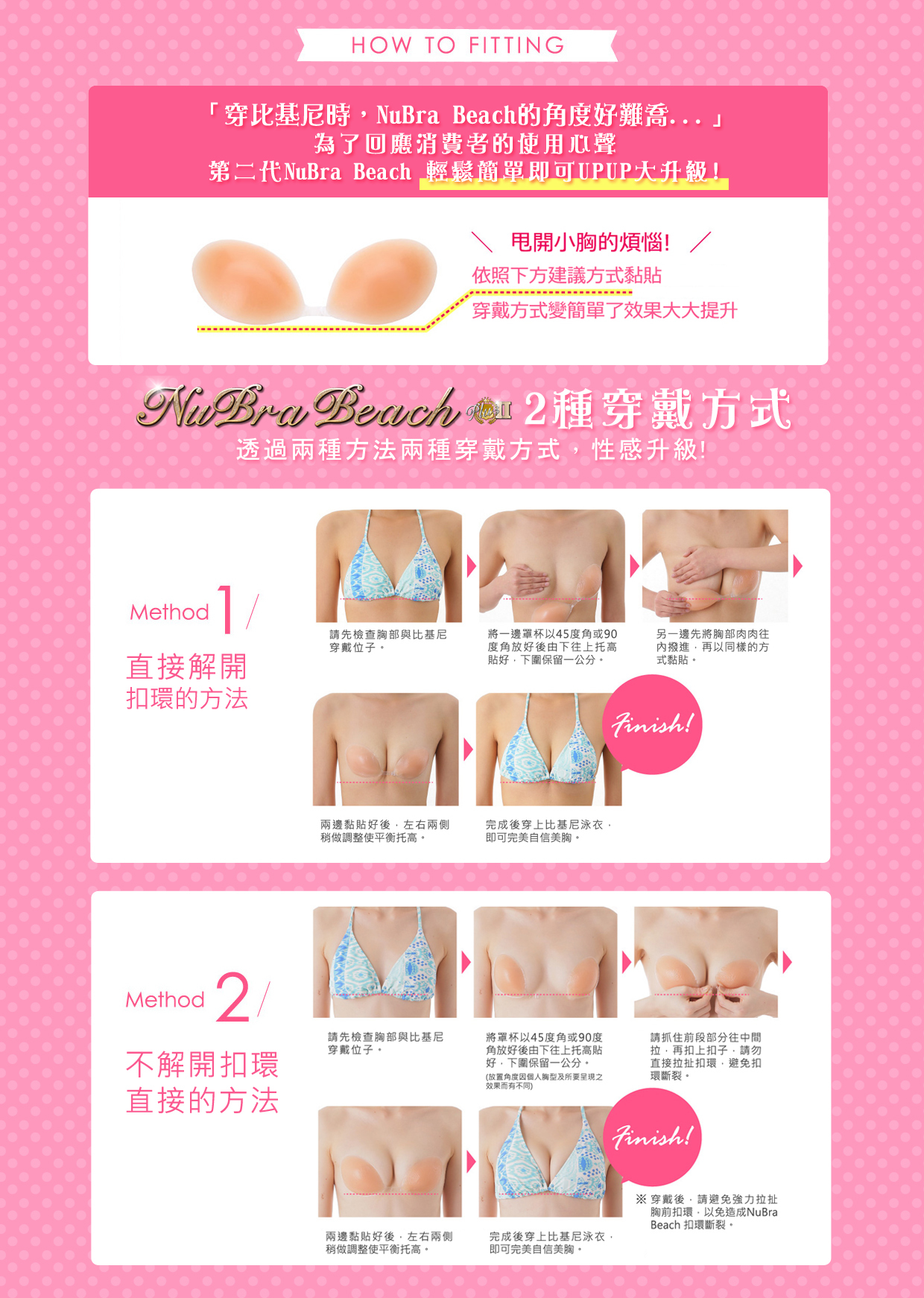 1. 因海水、游泳池成分可能影響膠面,黏貼次數會較一般NuBra商品短喔!)