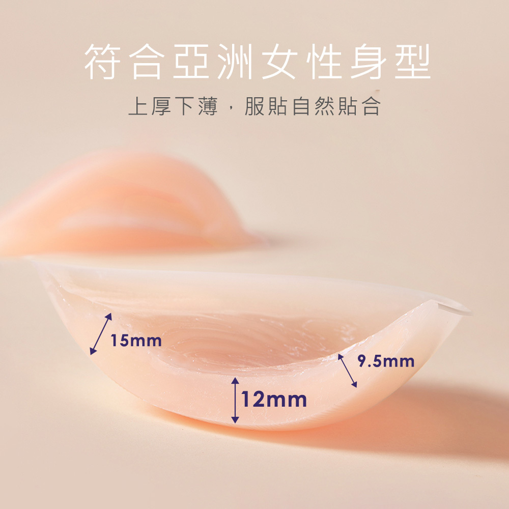 針對亞洲女性常見的上胸空缺問題,NuBra 經典矽膠運用上厚下薄的設計,自然補足提拉,視覺升級罩杯,輕鬆擁有渾圓飽滿的胸型