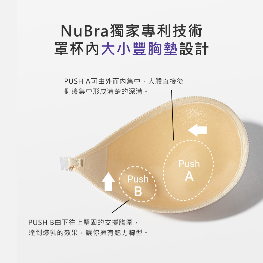 NuBra Seamless Push Up 採用一體成型無痕包邊設計,服貼不翹邊,輕盈貼合胸型,穿著時線條自然平滑,適合露背或貼身造型穿搭